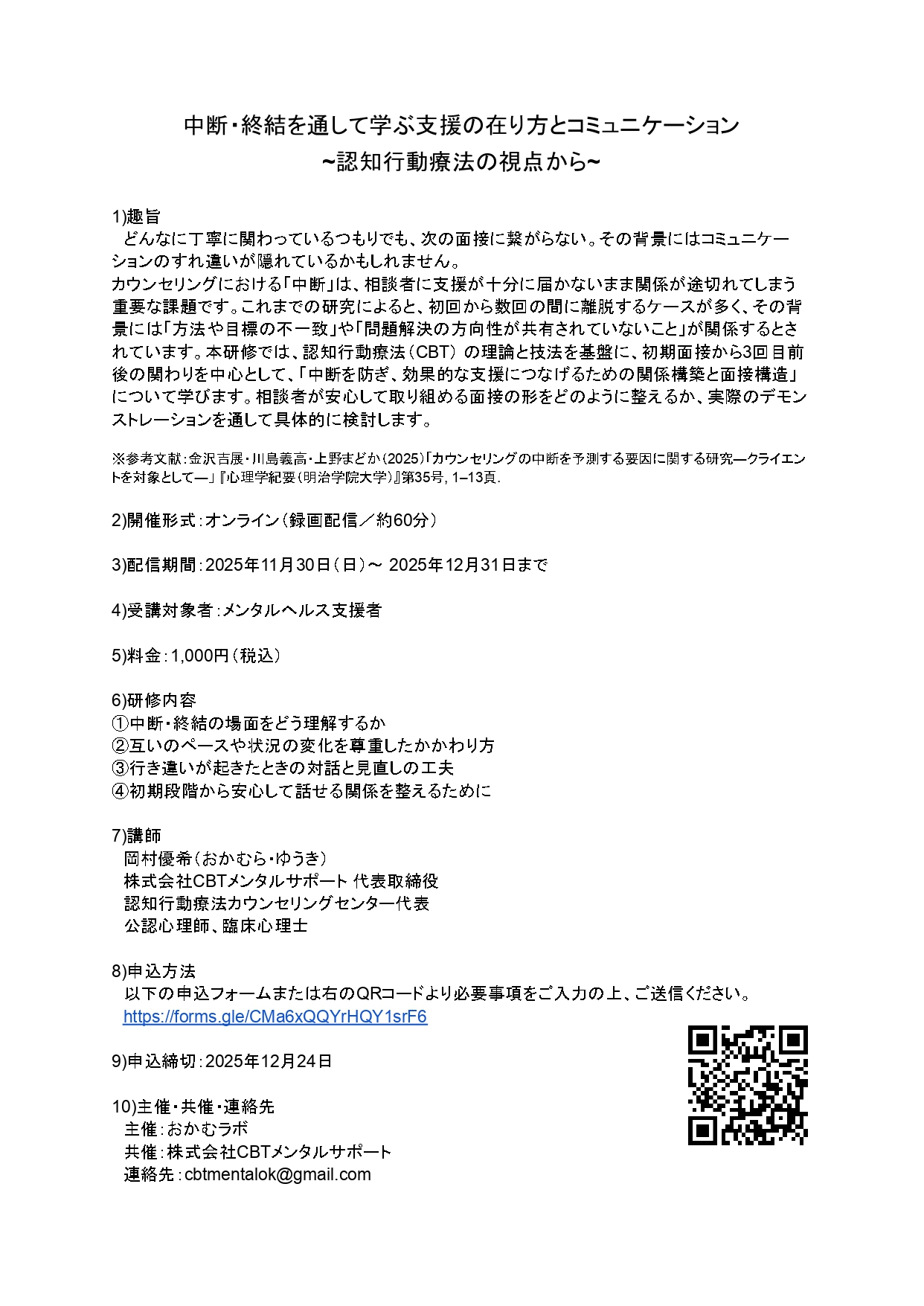 カウンセリングにおける「中断」は、相談者に支援が十分に届かないまま関係が途切れてしまう重要な課題です。これまでの研究によると、初回から数回の間に離脱するケースが多く、その背景には「方法や目標の不一致」や「問題解決の方向性が共有されていないこと」が関係するとされています。本研修では、認知行動療法(CBT) の理論と技法を基盤に、初期面接から3回目前後の関わりを中心として、「中断を防ぎ、効果的な支援につなげるための関係構築と面接構造」について学びます。相談者が安心して取り組める面接の形をどのように整えるか、実際のデモンストレーションを通して具体的に検討します。